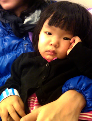 This December has not been good in terms of health for our family.  I was literally sick for 3 weeks, starting at the end of November.  Then, about 4 days ago, Adele came down with a fever and a cough.  Since this happened over Christmas, there were some mandatory family events that we could not miss.  So, we dragged her with us to a couple of parties, and even to my own birthday party (which was a surprise, by the way...but more on that in another post).  This is the 4th day that she's had the fever and we're starting to get a little worried.  My brother, Eric, who's a family doctor, took a brief look at her and thought she was not in too bad of a shape.  But he didn't have his "tools" (what are they called anyway?), so he couldn't properly examine her.  In any case, she's just constantly tired and is sleeping probably 80% of the day.  It sort of worries me what infection she's got.